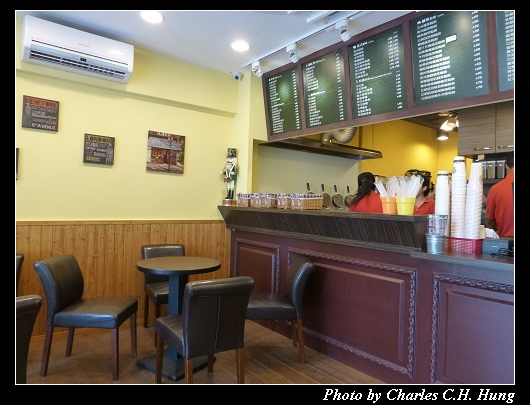 ▼ 雖然不能如學校內的小木屋整間都是木頭做的,不過店內的裝潢也是大多以木工為主,店面的空間配置上,櫃臺與廚房幾乎就佔了一半的空間,而小圓桌在店內一共有三桌,椅子的數量共有11張,因此很多人都是來外帶居多,由於所有的鬆餅都需要手工製作,所以店內的工作人員還滿多的,這天就看到四個工作人員在服務。