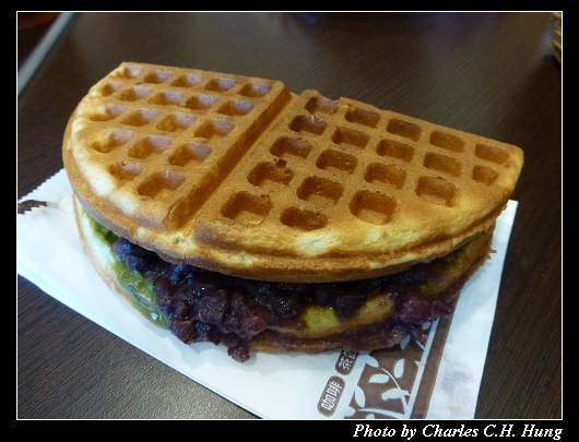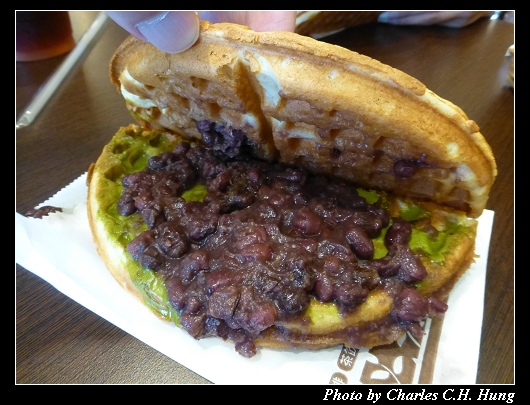 ▼ 抹茶紅豆鬆餅,外頭的鬆餅皮是一樣的,只有裡頭的內餡不同而已,這款裡頭有先塗上抹茶醬後,再加上滿滿的紅豆餡,口味還不錯,紅豆餡並不會過甜,也是一樣冷的熱的都好吃。