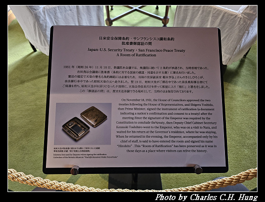 ▼ 在寧樂Nara隔壁的這個房間很特別,這裡與《日美安保條約》相關。1951年日本參眾二院通過了《日美安全保障條約》,並由當時的日本首相吉田茂在會議後於批准書上署名,但因為日本憲法規定,與外國締結條約還需要天皇的署名,而當時昭和天皇正好在奈良訪問,所以由當時的官房副長官帶著批准書,在昭和26年11月19日,來到當時還是奈良縣知事公舍的這個房間內,由昭和天皇親自署名,這個房間就保持著當時的原貌,讓入住奈良紫翠豪華精選酒店的房客可以站在門外參觀。