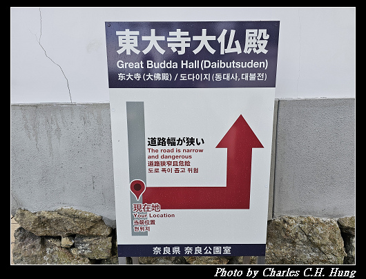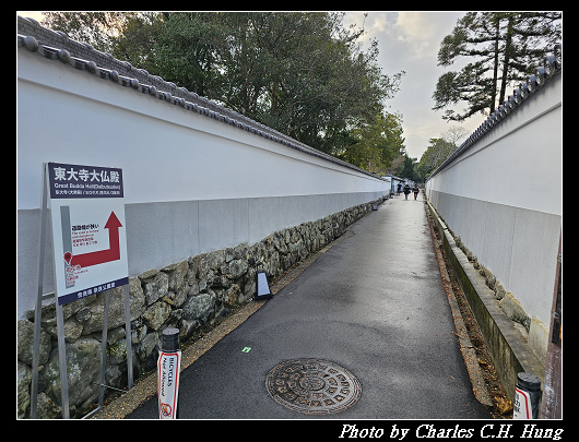 ▼ 飯店的住宿樓在主樓的隔壁,中間隔著一條小巷子,直走出去會通到大宮通り。巷子口立了一塊通往東大寺大佛殿的指引牌,還特別標記道路狹窄且危險,這應該是針對開車的人而寫的警語,如果根的導航走,搞不好會被帶進來這條路裡面,走路的話是沒有問題的。