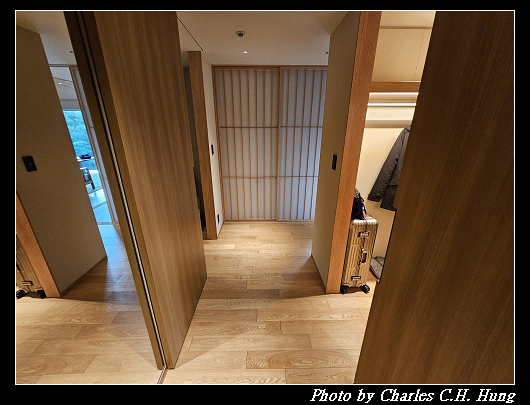 ▼ 進入房間,迎面而來的是一道短短的玄關走廊,右側的門內是更衣室,也可以從那邊直接進入臥室中,左前方有一個小小的門,裡面是廁所的空間,這個房間是將廁所及浴室分開設置的設計,滿多日本飯店也都是這樣的設計方式。