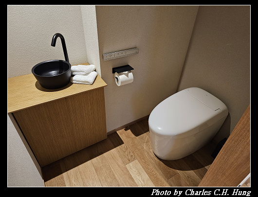 ▼ 廁所內的空間還滿大的,配置的是免治馬桶,控制面板就安裝在旁邊的牆面上,旁邊還有個小小的洗手台,檯面上可以放置物品。