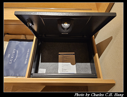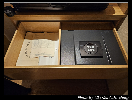 ▼ 下方的抽屜內,有一個數位式保險箱,採用上掀的打開方式,裡面的空間並不是太大,大概只能放置一些小物品而已。旁邊還有洗衣袋,需要在飯店內洗衣服的話,也可以使用付費的洗衣服務。