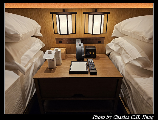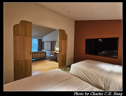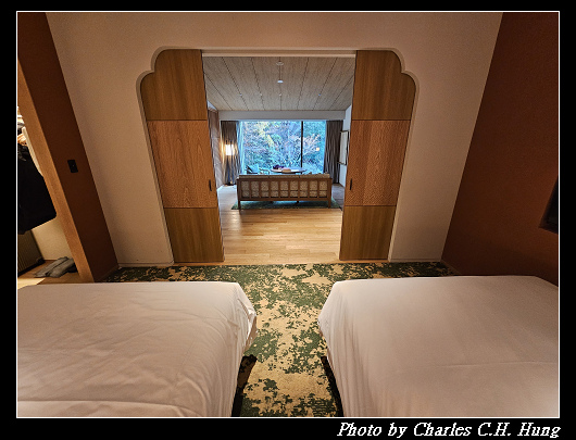 ▼ 隔壁就是臥室,我們這次的房型是精緻溫泉套房(Jr. Suite Onsen, Junior Suite, 2 Twin, Sofa bed, Garden view),臥室內為二張雙人床的布置,因為 房間位於二樓,屋頂有個斜面的設計,臥室的天花板看起來有種閣樓的感覺,氛圍相當不錯。