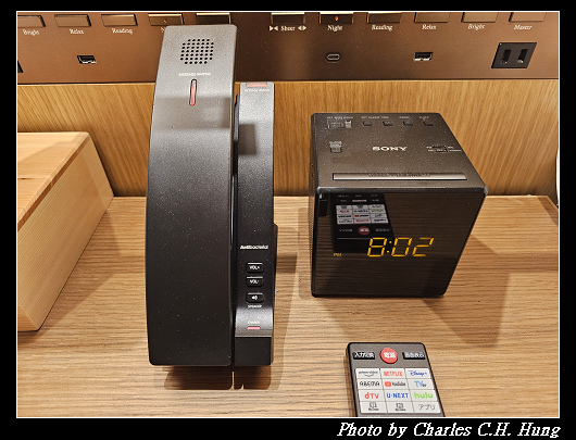 ▼ 使用的電話是功能很單純的機種,沒有太多複雜的功能,方便操作。旁邊還有一個SONY的數位音箱,可以做為鬧鐘來使用。
