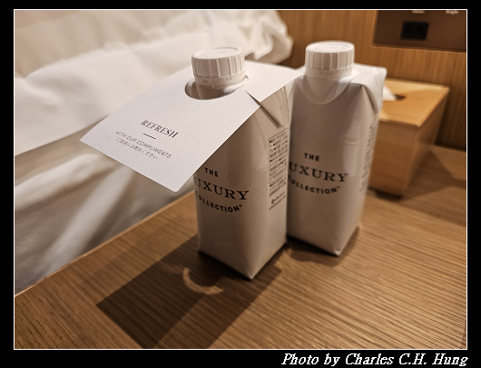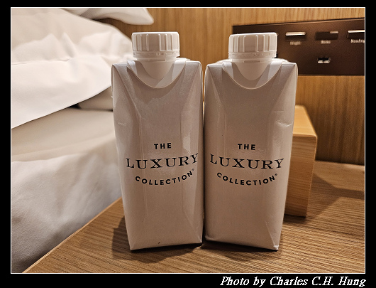 ▼ 房間內提供的飲水,是這種紙盒包裝的水,看起來是奢華酒店專用的產品,包裝上只有印上The Luxury Collection字樣,包裝的質感還不錯,但就不方便攜帶外出飲用了。