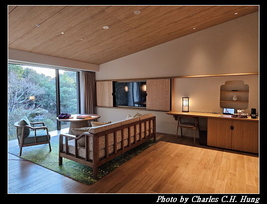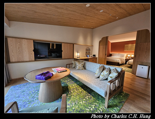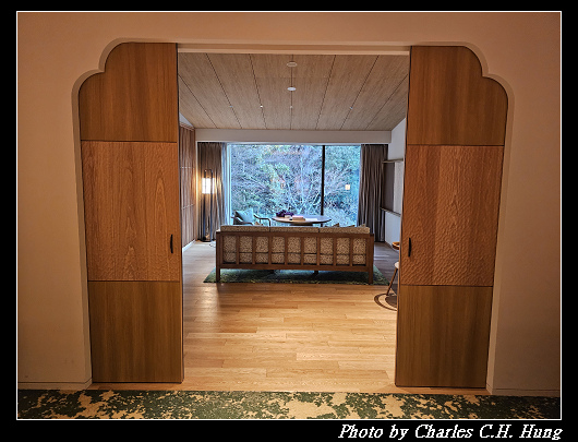 ▼ 從床舖的位置,看出去客廳的角度,視線穿越客廳,就可以看到飯店後方的日式庭園,整個景觀是還滿漂亮的,也充分的運用了日式庭園中借景的技巧。
